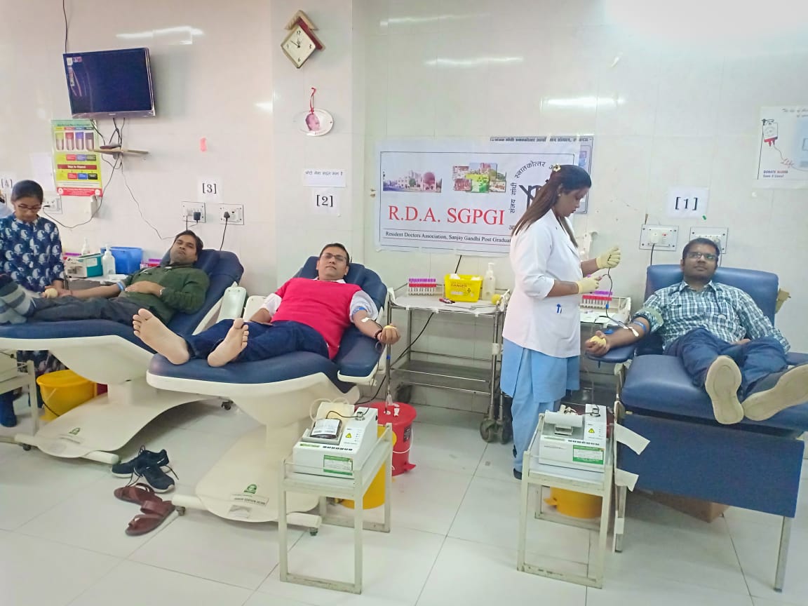 लखनऊ।आज एसजीपीजीआई प्रांगण में रेजीडेंट डॉक्टर एसोसिएशन द्वारा ब्लड डोनेशन कैंप का आयोजन किया गया| मांगों के समर्थन में केजीएमयू और लोहिया संस्‍थान के रेजीडेंटस भी आये।  विगत दिनों प्रयागराज में हुई कैबिनेट की ऐतिहासिक बैठक मे एसजीपीजीआई के कर्मचारियों को एम्स के समान वेतनमान देने की स्वीकृति दी गई थी।इस घोषणा में रेसिडेंट डॉक्टरों को अलग रख गया था।इसी के विरोध में रेजीडेंट डॉक्टर “एक सांस्था, एक विधान” के सूत्र को मानने हेतु एक नए अंदाज में अपने पक्ष को रखा।आंदोलन की इसी कडी में आज रेजीडेंटस डॉक्टरों ने लगभग 100 यूनिट ब्लड डोनेट कर मरीजो के हित में एक सकारात्मक पहल तो की ही साथ ही विरोध का एक नया अंदाज़ भी पेश किया।अपनी मांगों के लिए वे अपना प्रयास करते रहेंगे।कल इन डॉक्टरों द्वारा वृक्षारोपण कर के सकारात्मक तरीके से अपना विरोध दर्ज कराया जाएगा।रेजीडेट डॉक्‍टर्स एसोसिएशन की कोर कमेटी के अध्‍यक्ष डॉ आशुतोष पाराशर, उपाध्‍यक्ष डॉ आकाश माथुर, संयोजक डॉ अनिल गंगवार, सचिव डॉ अक्षय और प्रवक्‍ता डॉ अजय शुक्‍ला ने बताया कि जब एम्‍स के बराबर वेतन देने की संस्‍तुति की गयी है तो फि‍र हम लोगों के साथ सौतेला व्‍यवहार क्‍यों? जबकि रेजीडेंट डॉक्‍टर भी अस्‍पताल का एक अभिन्‍न अंग है।
